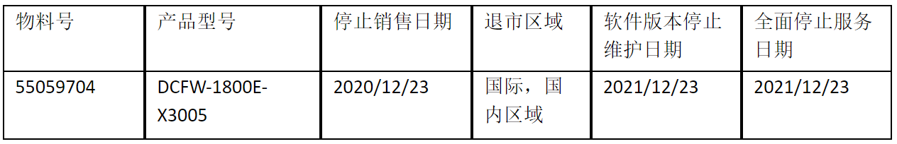北京神州数码多宝电竞信息技术有限公司正式通知您, 以上DCFW-1800E-X3005下一代防火墙(55059704)将于2020年12月23号停止接收新的订单(具体日期见上表),不再供货。给您带来的不便,敬请原谅。